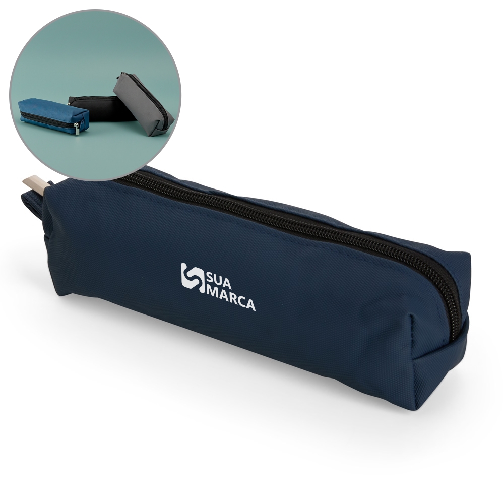Estojo confeccionado em couro sintético com fechamento em zíper e uma pequena alça para fixação em chaveiro ou gancho.