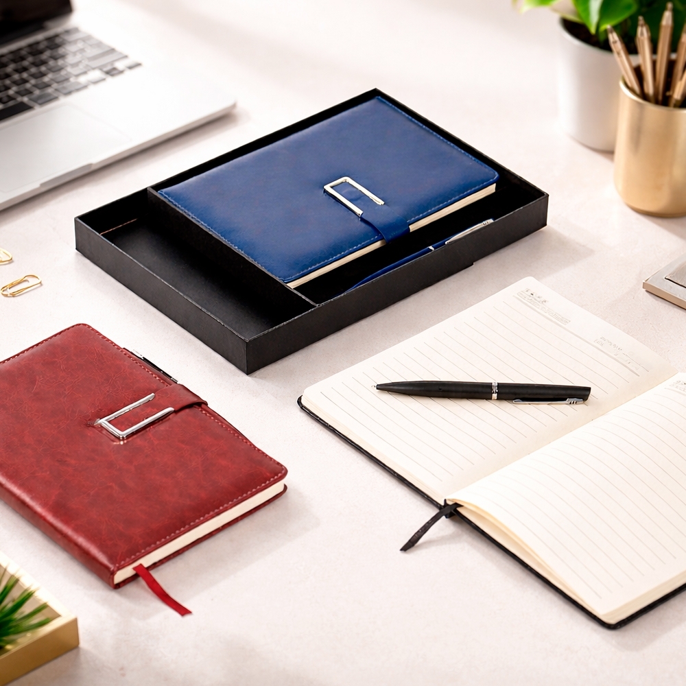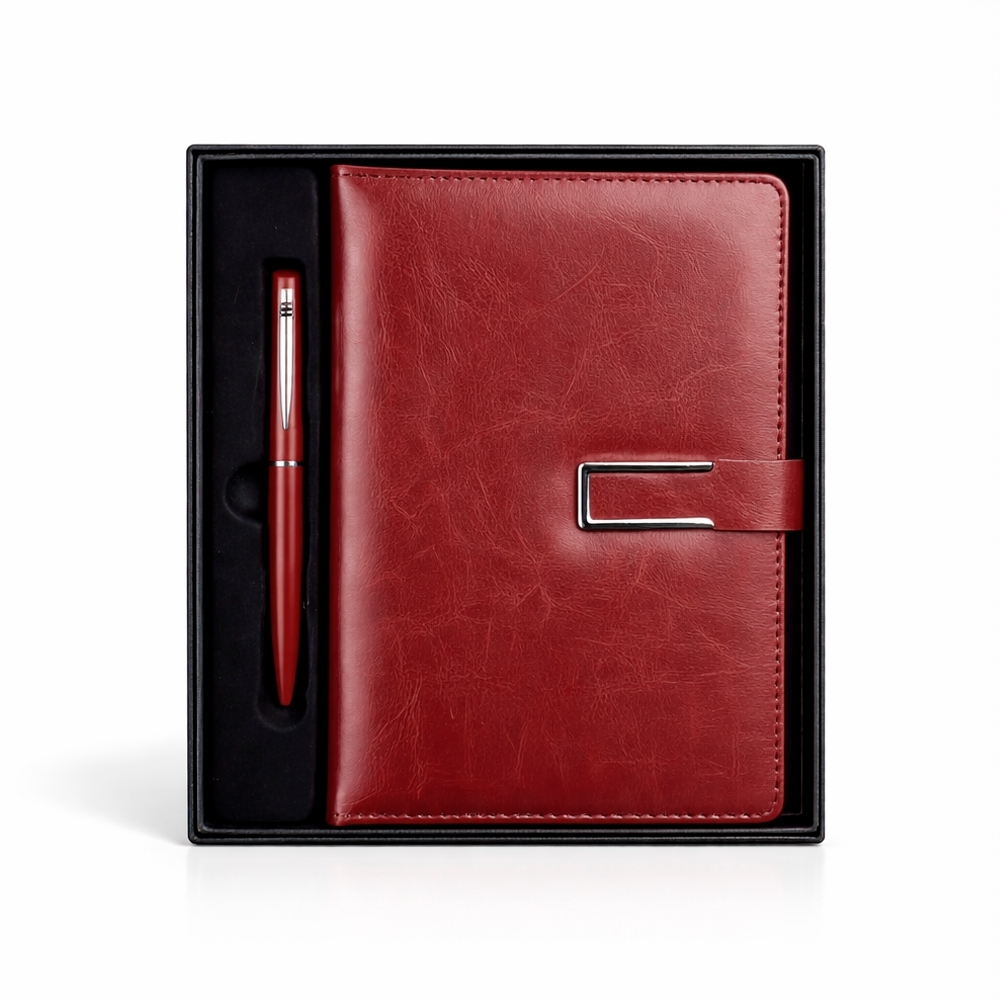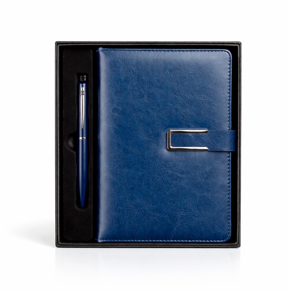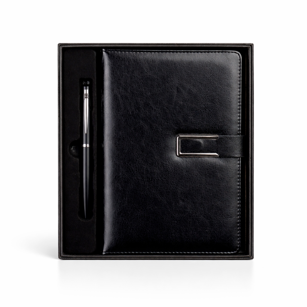 Descrição: Kit executivo composto por dois itens: uma caderneta e uma caneta. A caderneta possui capa em couro sintético, fecho magnético com detalhe metálico na aba, marca-páginas em fita de cetim e cerca de 96 folhas marfim pautadas e espaço para assinalar dias da semana e datas numéricas. A caneta metálica conta com acionamento por rotação e carga esferográfica azul de 1,0mm. Acompanha caixa em papelão com berço em plástico para guardar os itens do conjunto.