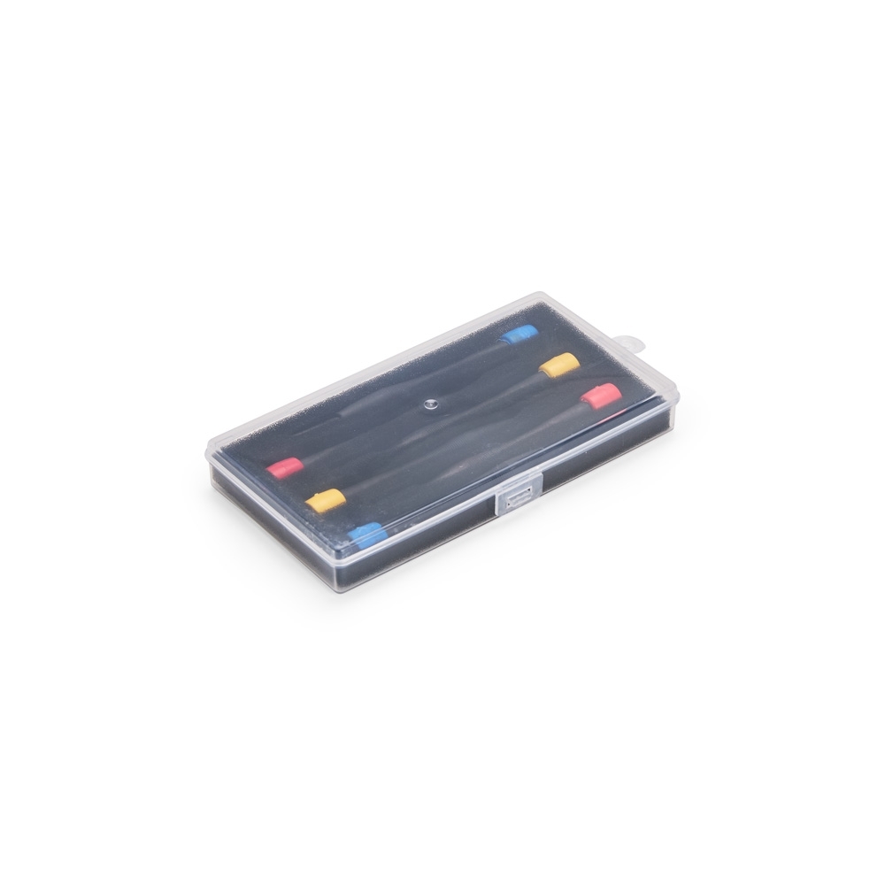 Descrição: Kit de ferramentas com seis chaves com cabo plástico e pontas metálicas. Contém quatro chaves de fenda e duas chaves Phillips com pontas em tamanhos diferentes. Acompanha estojo plástico com espuma removível para acomodar as peças.