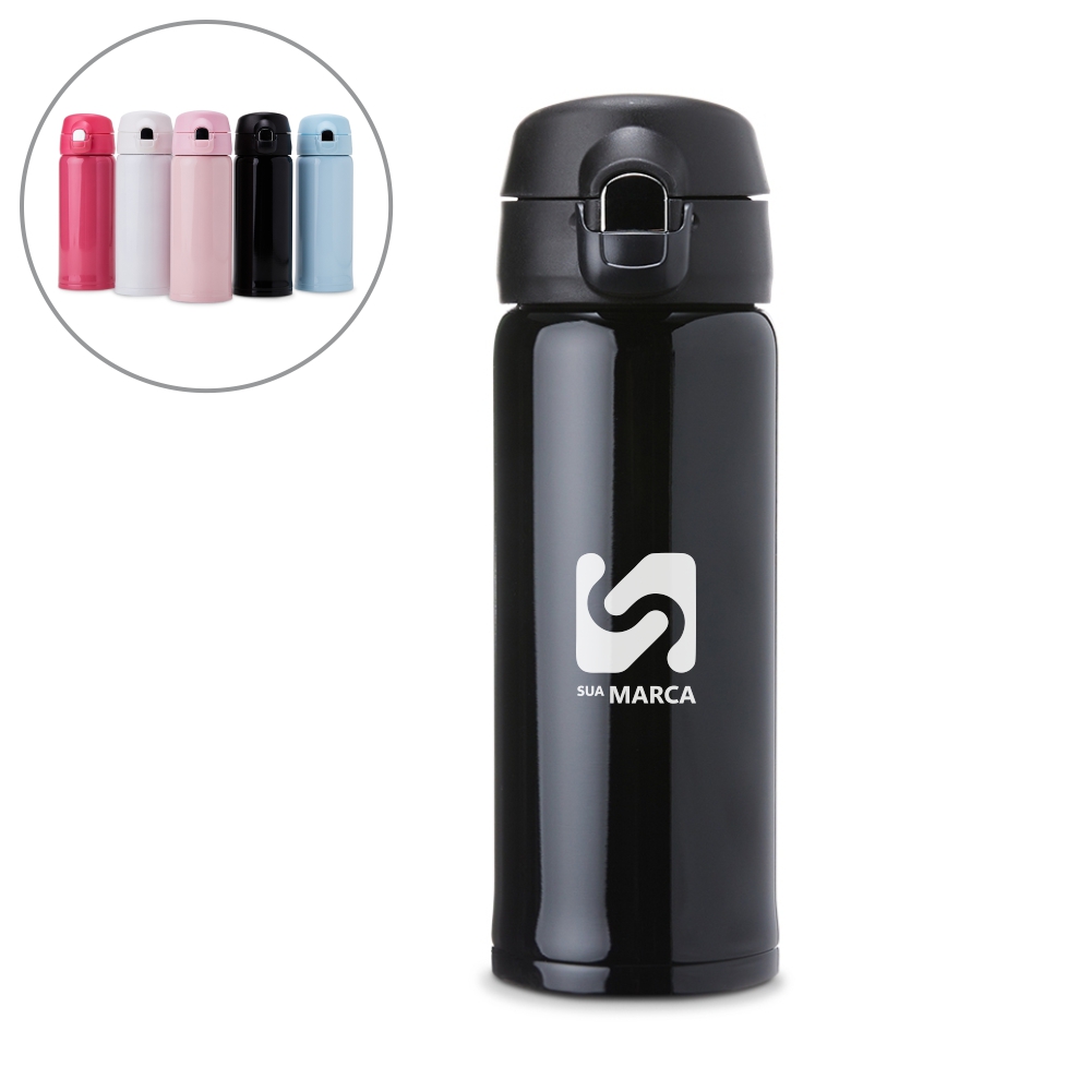 Garrafa inox 304 com capacidade de 400ml. Tampa de polipropileno com botão de acionamento e trava de segurança.