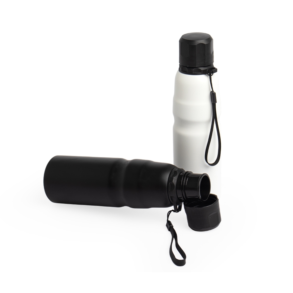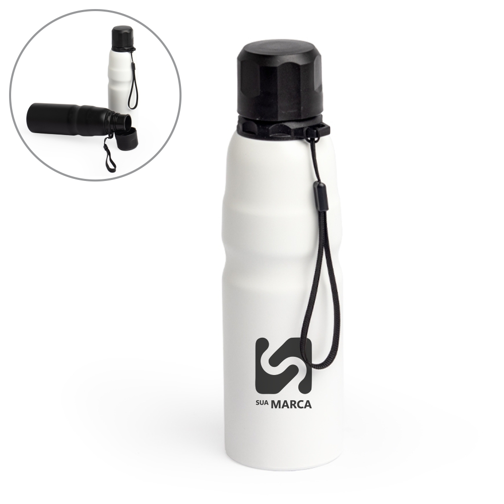 Descrição: Garrafa inox 800ml com tampa plástica rosqueável e cordão para transporte.