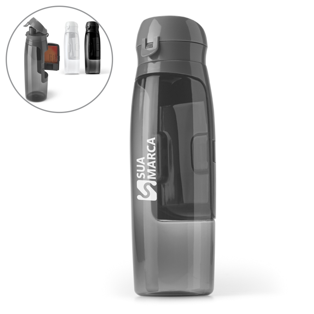 Garrafa. Squeeze. Tritan™. Com compartimento para cartões, chaves e dinheiro. Capacidade: 800 ml. Food grade. Caixa branca 94658 vendida opcionalmente. ø80 x 260 mm.