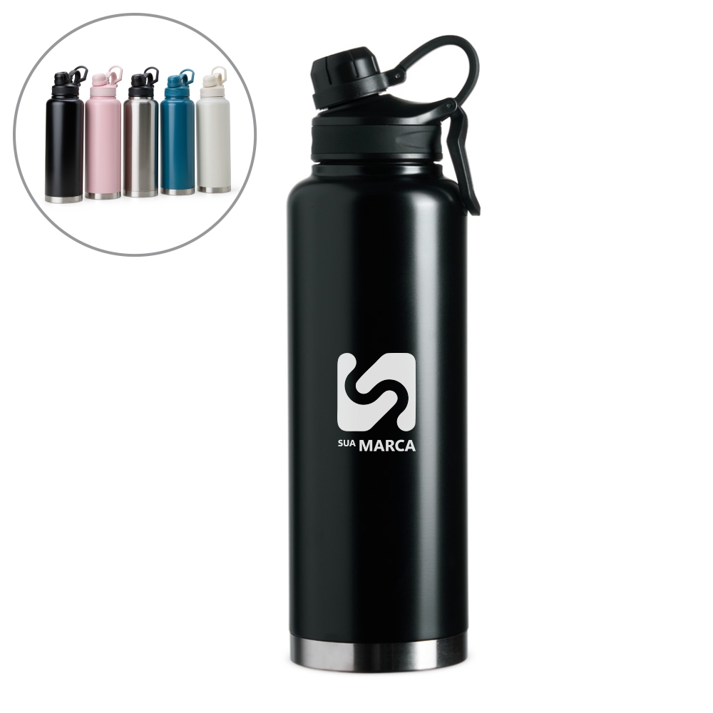 Garrafa Térmica em inox 304 de parede dupla com capacidade de 1,5 litros. Possui tampa com alça para transporte e tampa rosqueável de proteção para o bocal.