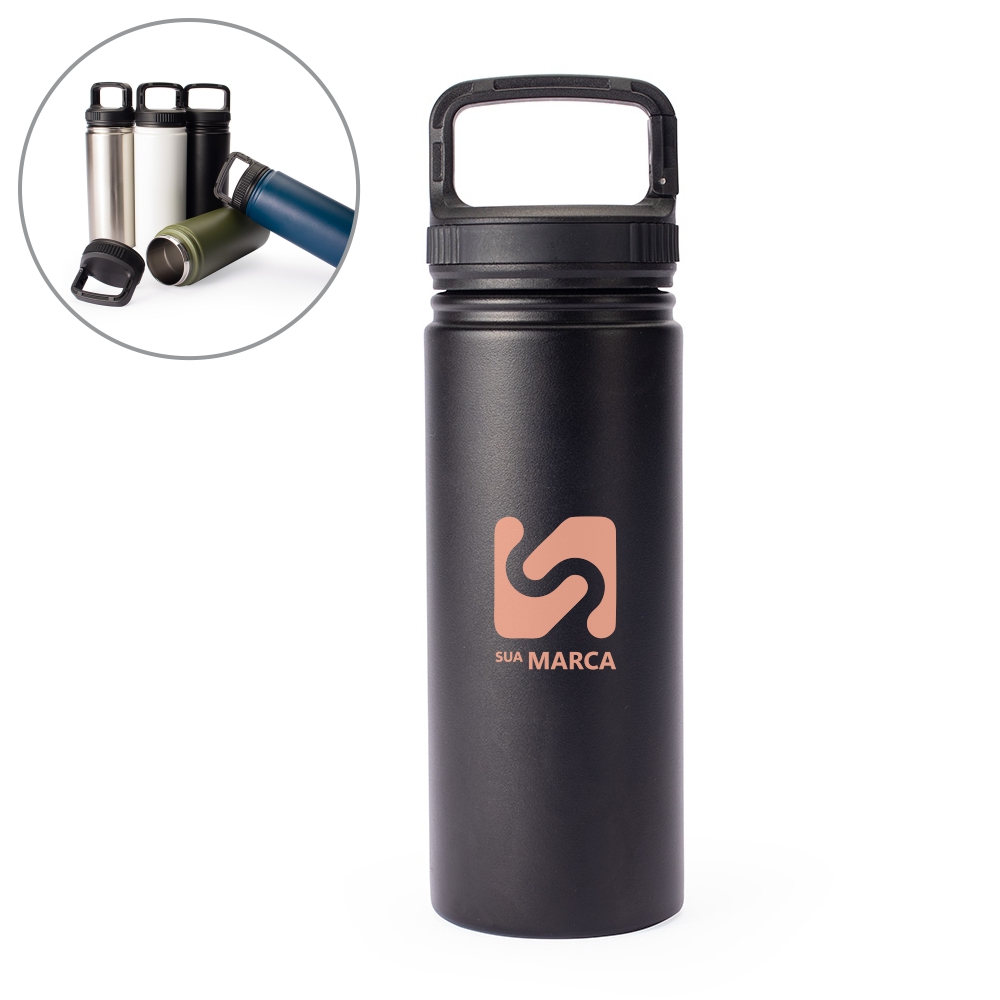 Descrição: A combinação de estilo e praticidade em uma só garrafa térmica. Com capacidade total de 500ml, construção em inox de parede dupla e isolamento a vácuo, esta garrafa térmica mantém a temperatura constante dos líquidos, evitando vazamentos e o contato direto com o calor ou frio do líquido durante o manuseio. A garrafa ainda conta com uma tampa rosqueável de plástico com uma alça em formato de presilha para facilitar seu transporte, prendendo-a em mochilas ou mantê-la em outros espaços.