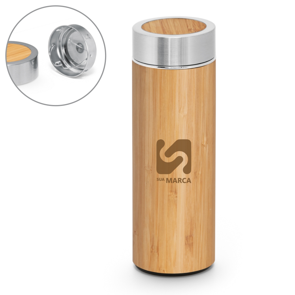 Garrafa térmica. Bambu e aço inox. Com parede dupla e infusor para chá. Capacidade até 430 ml. Fornecida em caixa presente. Food grade. ø69 x 207 mm | Caixa: 72 x 210 x 72 mm.