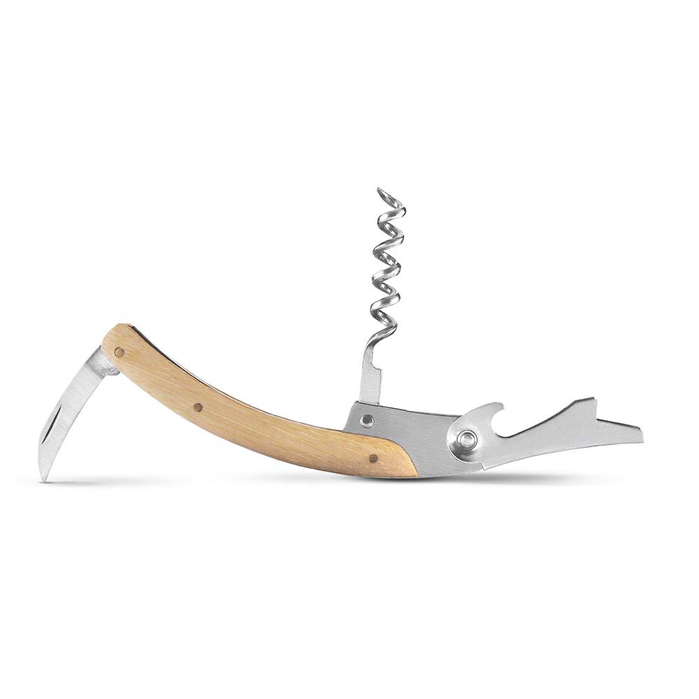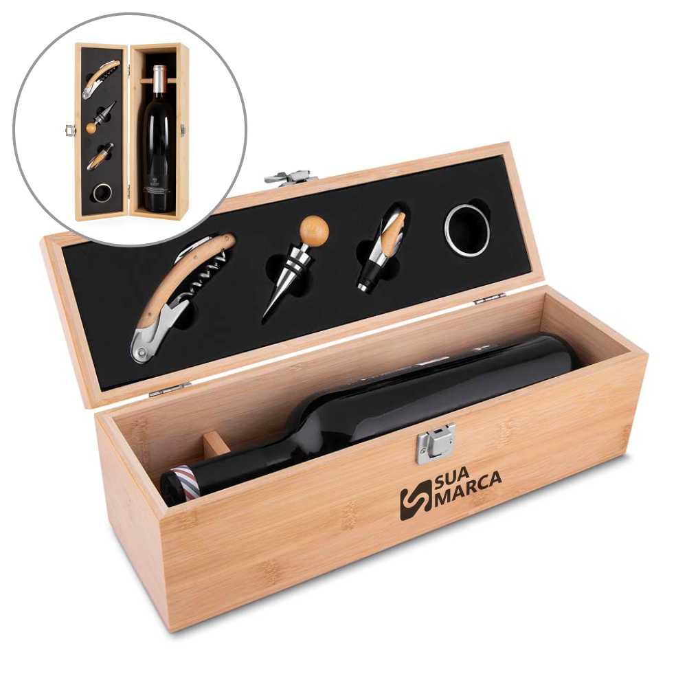 Kit Vinho em bambu com interior em EVA e fecho em inox, suporte para garrafa de vinho de 750 ml (padrão). Contém: saca-rolha de metal com detalhes em bambu e cortador de lacre, anel corta-gotas de metal, bico para servir de metal com tampa em bambu e tampa de metal com detalhe em bambu.