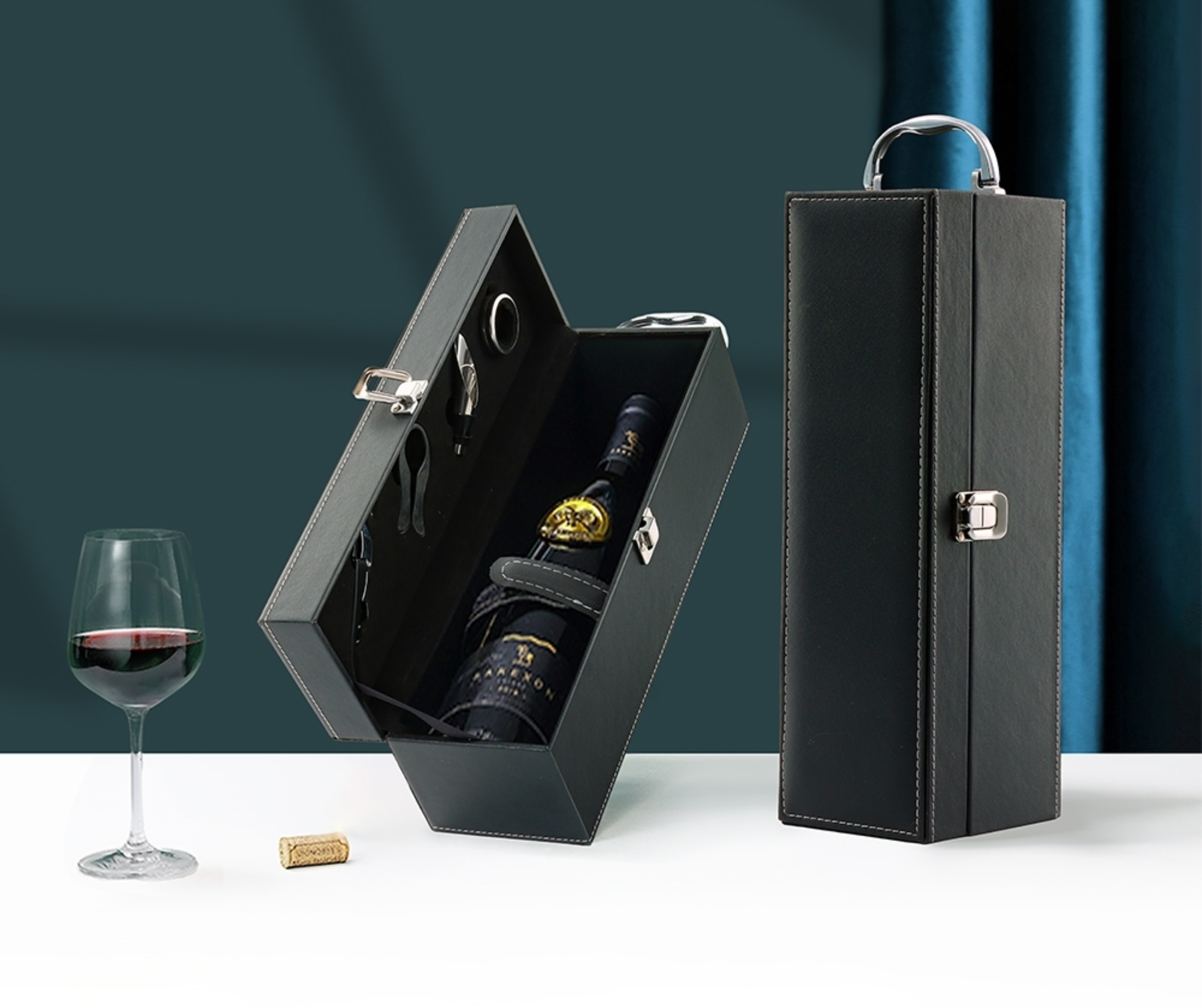 Kit vinho 4 peças em maleta de couro sintético. Contém saca-rolhas metálico, bico condutor com tampa, cortador de lacre e wine colar. Maleta com alça, trava de segurança e parte interna revestida de veludo com área de acomodação para garrafa. NÃO acompanha vinho.