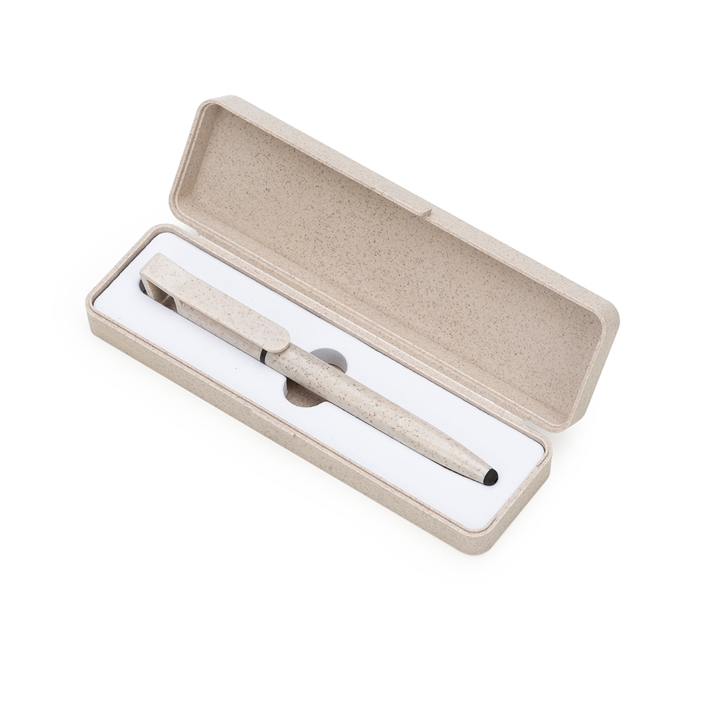 Ref. BX 00708T - Caneta fibra de bambu com suporte para celular, ponteira touch screen e limpador de tela. Carga esferográfica azul 1.0 mm e acionamento por rotação. Neste kit, acompanha estojo de ref. 10398P