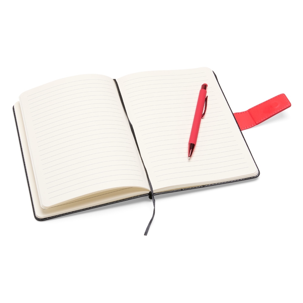 BX19013 - Kit Executivo 2 Peças composto por uma caderneta de capa em couro sintético com fechamento magnético e cerca de 80 folhas pautadas, e uma caneta em metal com detalhes em plástico, ponteira emborrachada para uso em dispositivos touchscreen e carga esferográfica azul de 1,0 mm. Acompanha uma caixa de papelão com berço em espuma para a caneta.