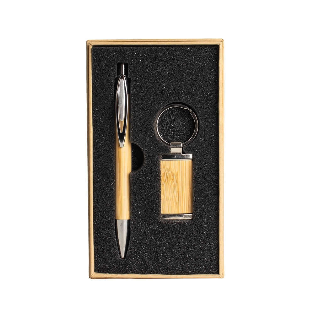 Descrição: Kit composto por 3 peças: sendo uma caderneta de bambu com capa dura, contendo aproximadamente 70 folhas brancas pautadas, uma caneta de bambu com clipe metálico e um chaveiro de bambu com detalhe em metal. Item perfeito para quem busca elegância, sustentabilidade e o toque natural que só o bambu proporciona.