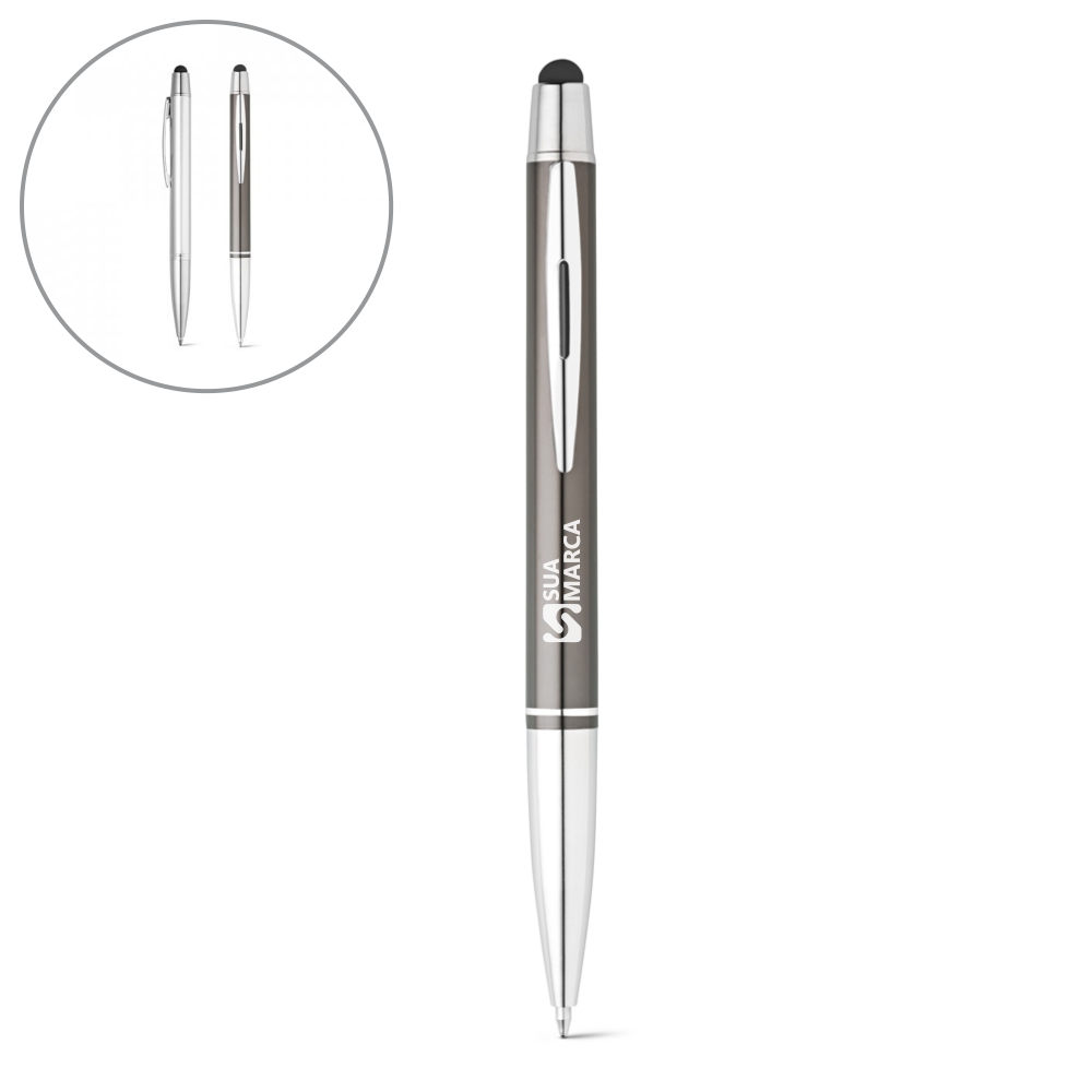 Esferográfica. Alumínio. Com ponteira touch. 1,5km de escrita. ø11 x 135 mm. Escrita a azul.