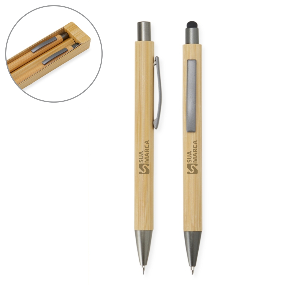 Conjunto caneta e lapiseira de bambu em estojo de papel. Caneta esferográfica azul 1.0mm com borracha touch, clipe metálico e acionamento por clique; lapiseira 0.7 com clipe metálico.