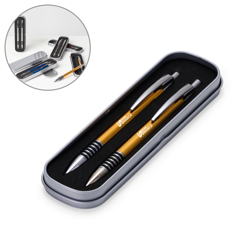 Descrição: Com este conjunto de caneta e lapiseira metálicas, escrever será uma experiência ainda mais sofisticada e elegante. O estojo em metal que as acomoda, possui revestimento em espuma para evitar riscos. A caneta possui carga esferográfica azul de 1.0mm, com acionamento por clique, já a lapiseira possui grafite 0.7mm.