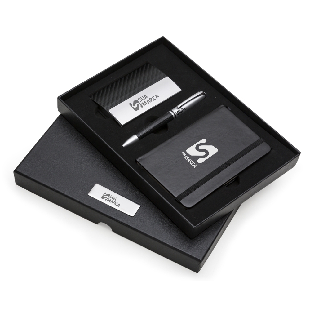 Medidas aproximadas para gravação (CxL): Placa 5,8 cm x 1,9 cm – Porta Cartão 9,3 cm x 2,4 – Caneta 4,5 cm x 1 cm – Caderneta 13,4 cm x 8 cm