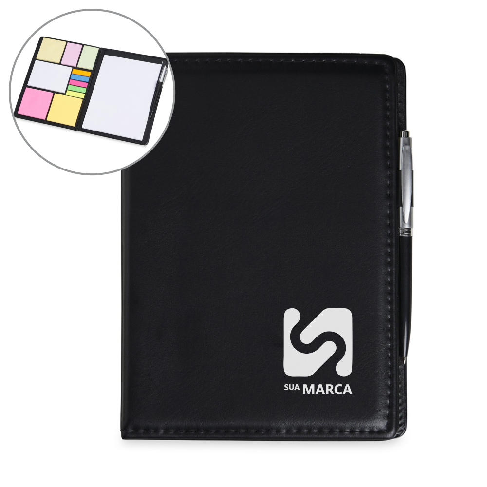 Descrição: Kit para anotações em couro sintético com autoadesivos e caneta plástica. Contém seis blocos com aproximadamente 50 folhas, conjunto de cinco marcadores plásticos autoadesivos com aproximadamente 26 folhas, bloco A5 com aproximadamente 50 folhas e caneta esferográfica com carga azul e acionamento por clique.