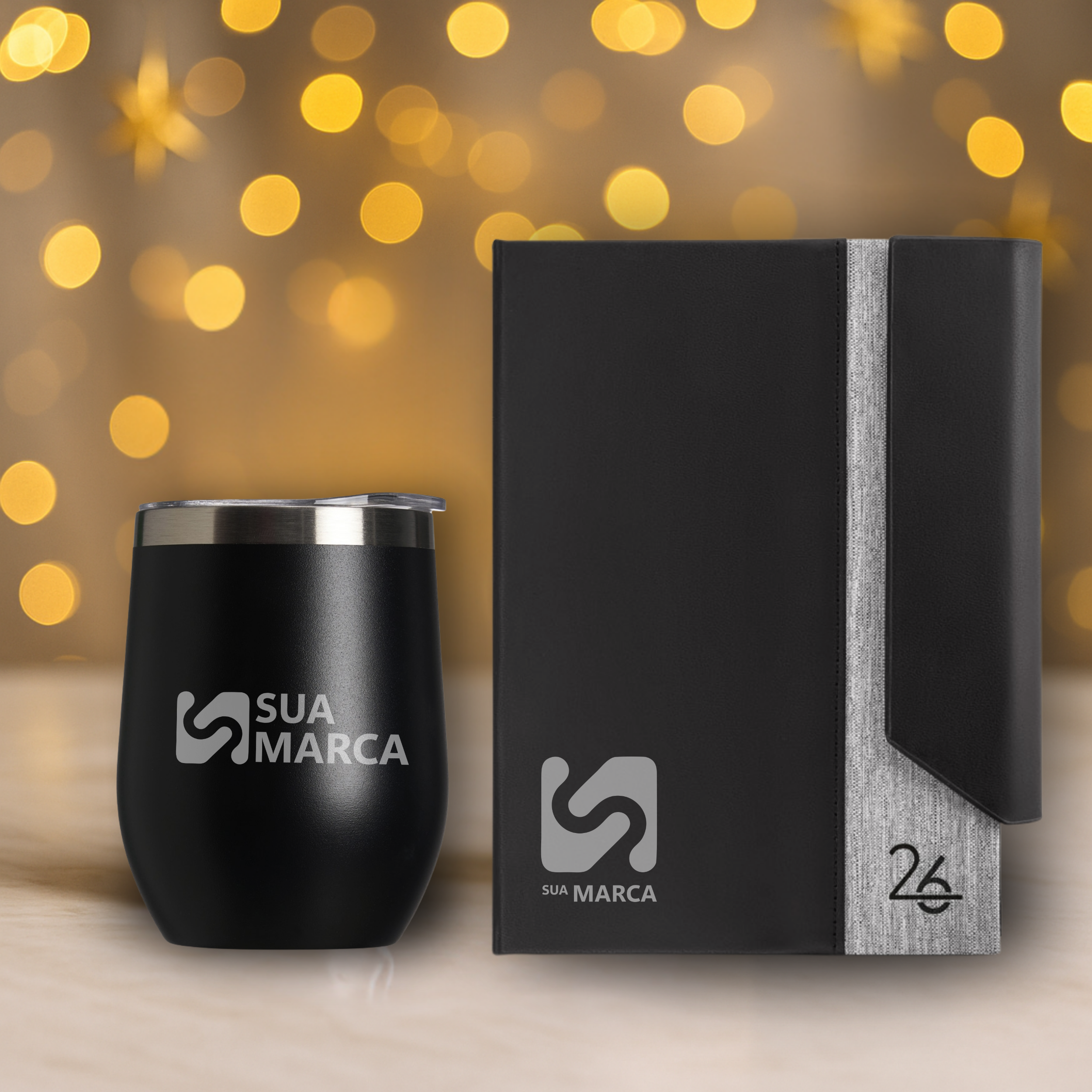 1 - Agenda A5 com fecho magnético. Possui um suporte para esferográfica (não inclusa) e marcador em fita. - Ref. BS66214 (solicite orçamento com modelo de caneta para compor o kit)