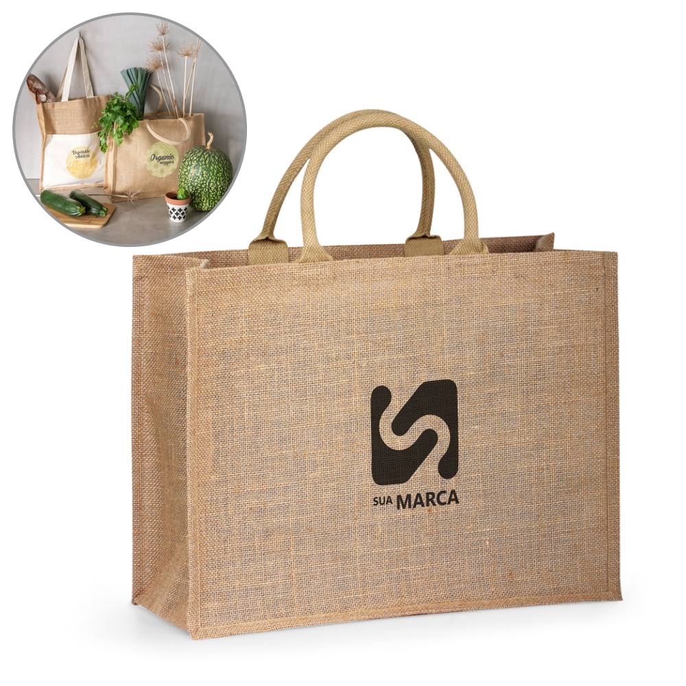 Sacola. Juta: 360 g/m². Com laminado no interior. Alças curtas acolchoadas. 430 x 340 x 175 mm.