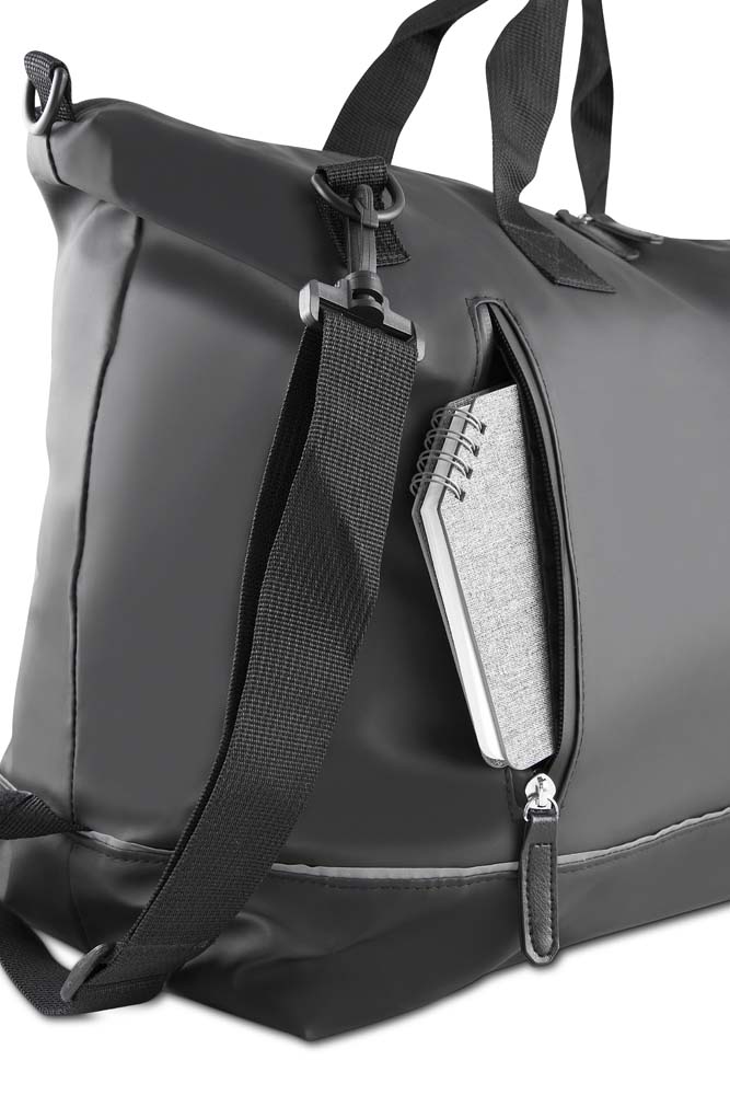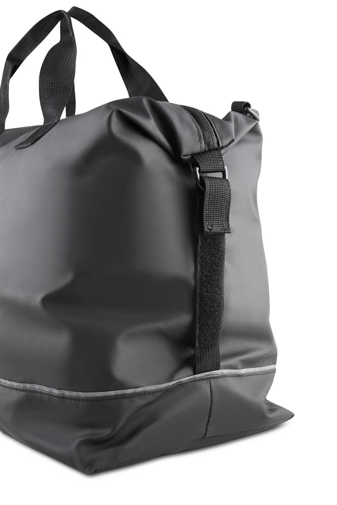 Mala esportiva em PU com revestimento interno em poliéster 210D. Possui faixa refletiva, bolso frontal com zíper, alça de mão e alça de ombro ajustável, além de dois compartimentos internos.