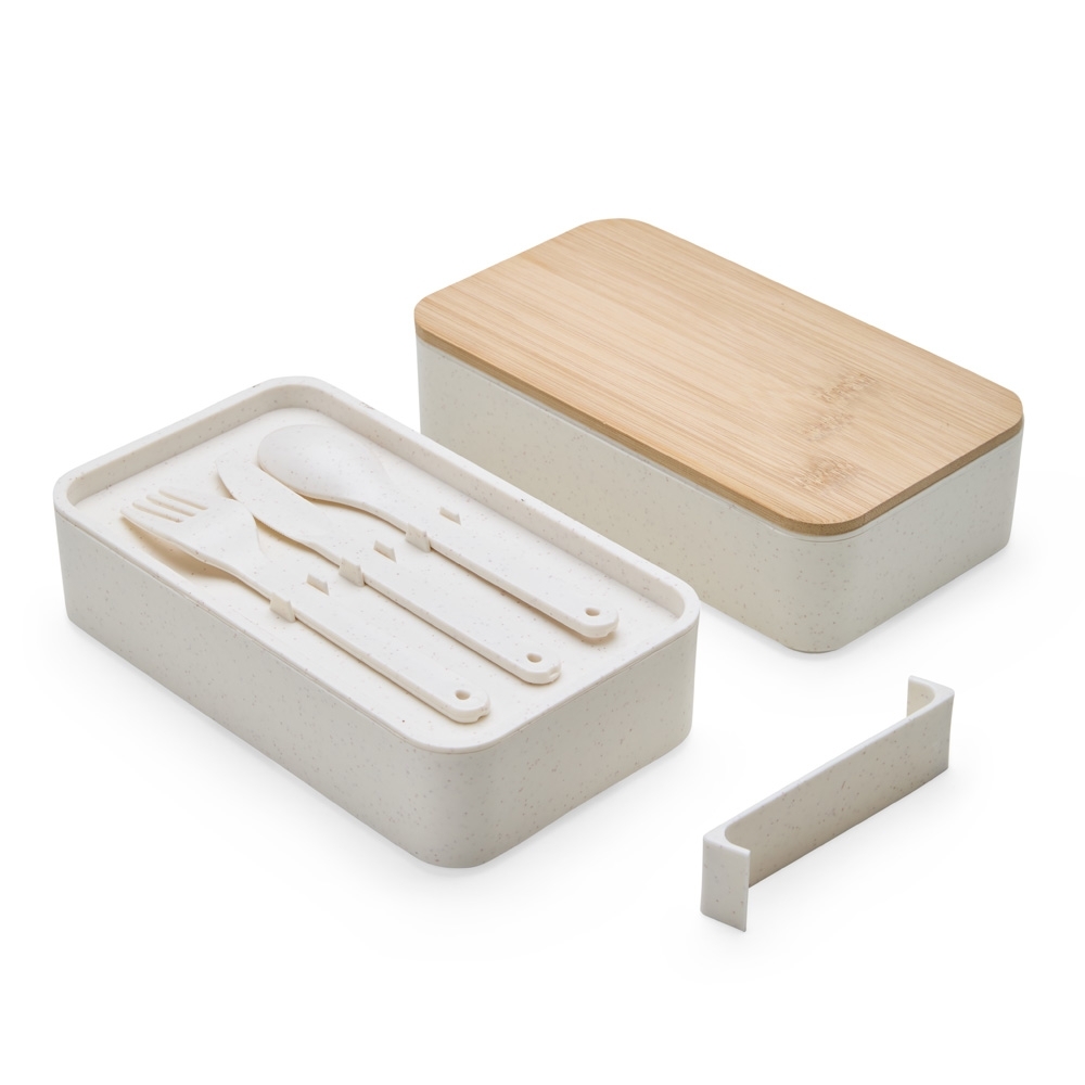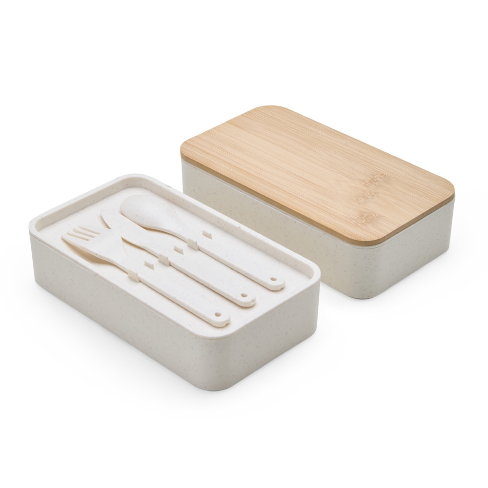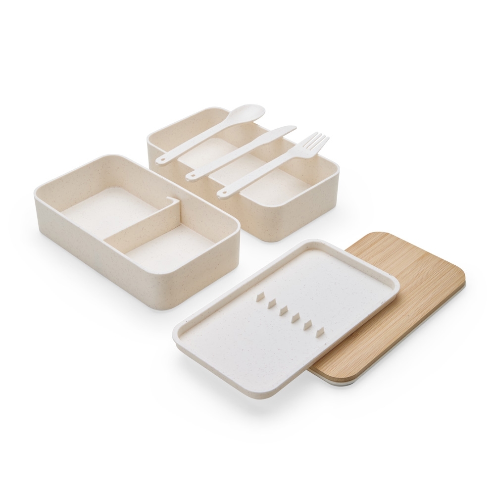 Descrição: Marmita dupla em fibra de trigo, sendo um compartimento de 600ml com tampa de bambu e outro compartimento de 500ml com suporte para talheres de fibra de trigo. Possui uma divisória removível e elástico para um transporte seguro. Acompanha garfo, faca e colher. Obs: O tempo de reaquecimento no micro-ondas não deve ultrapassar 3 minutos.