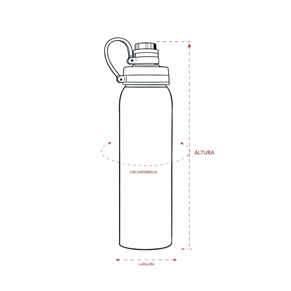 Garrafa em inox com capacidade máxima de 800ml. Possui tampa plástica com protetor rosqueável para o bocal e alça fixa em silicone.