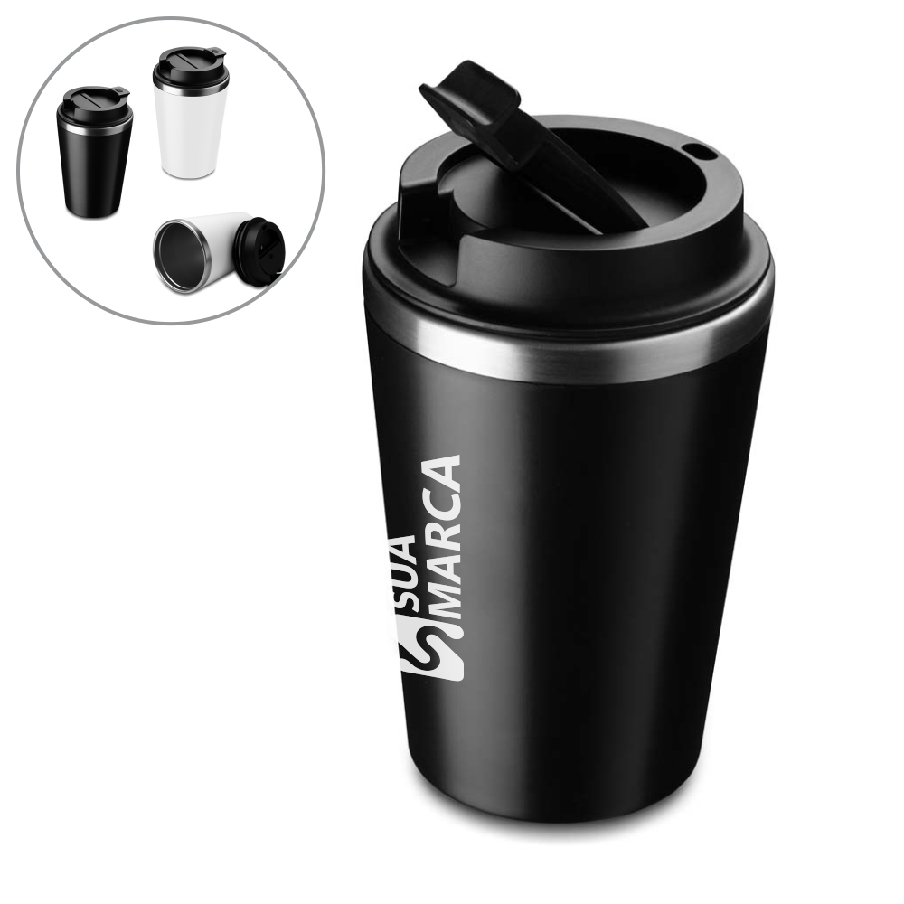Copo de 350 ml com parede dupla, interior em inox 304 e exterior em plástico PP, tampa em plástico PP e acabamento com pintura fosca.