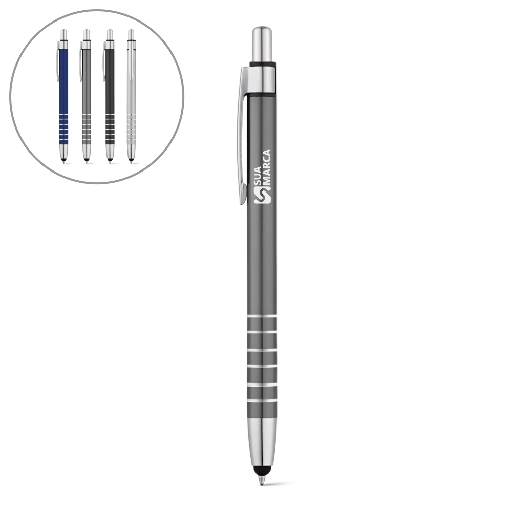 Esferográfica. Alumínio. Com ponteira touch. 1,5km de escrita. ø9 x 138 mm. Escrita a azul.