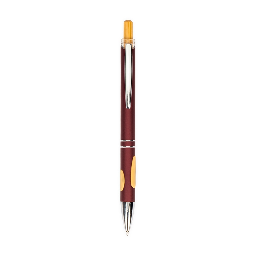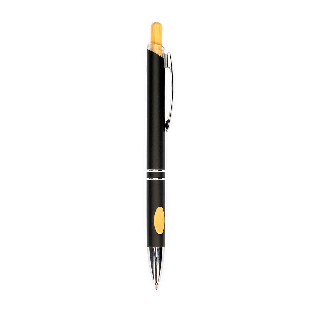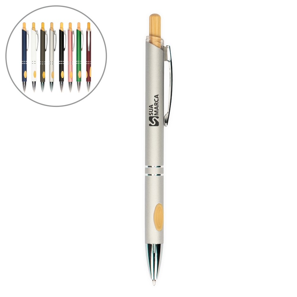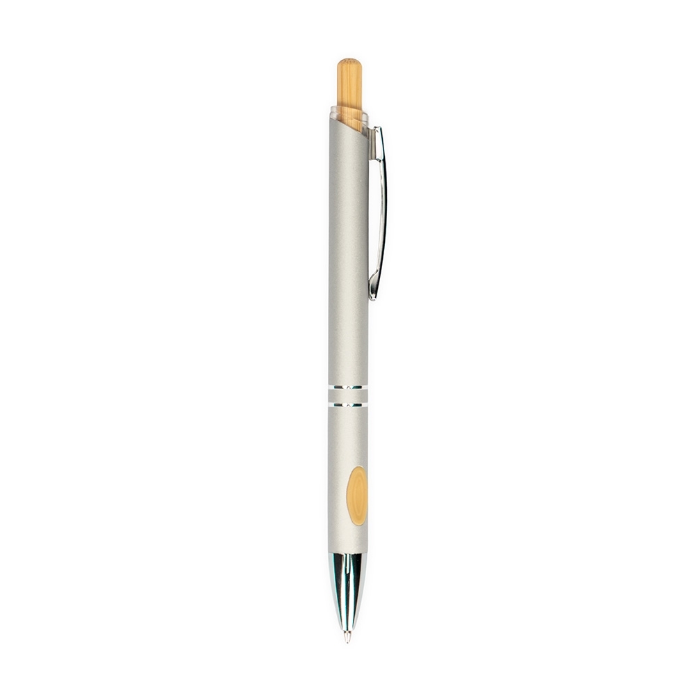 Caneta metálica com detalhes emborrachados no corpo, acionamento por clique com parte superior em bambu, carga esferográfica azul de 1.0mm, o que proporciona uma pegada leve e uma escrita precisa.