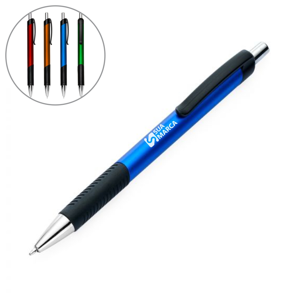 Caneta plástica colorida com detalhes preto. Clip plástico preto e acionador prata, parte inferior possui detalhe emborrachado com relevo. Aciona por clique.