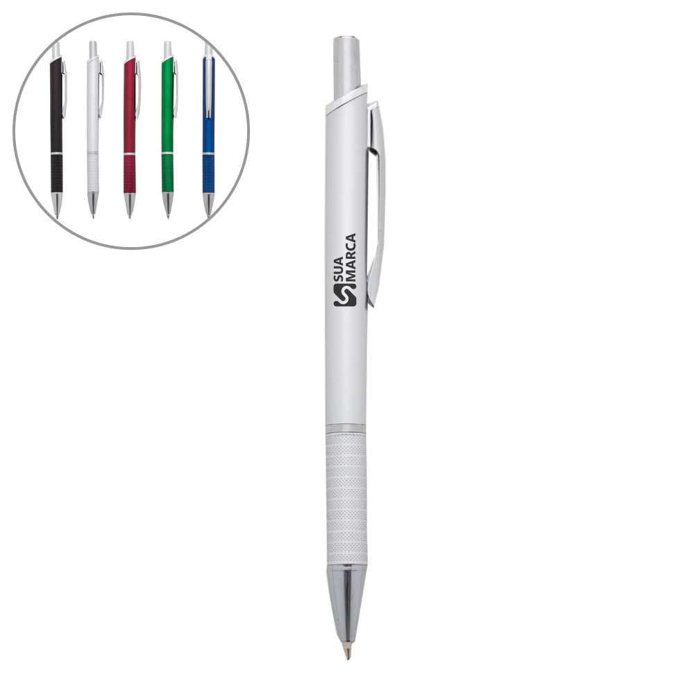 Caneta plástica fosca inteira colorida com detalhes prata. Clip de metal, anel prata e parte inferior da caneta possui detalhes com relevo, aciona por clique.