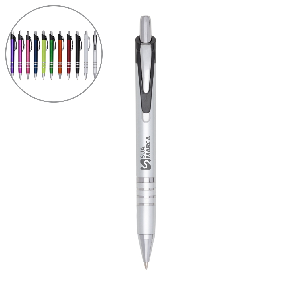 Caneta plástica inteira colorida com detalhes prata. Possui clip de metal com detalhe plástico preto, parte inferior com três anéis coloridos. Aciona por clique.