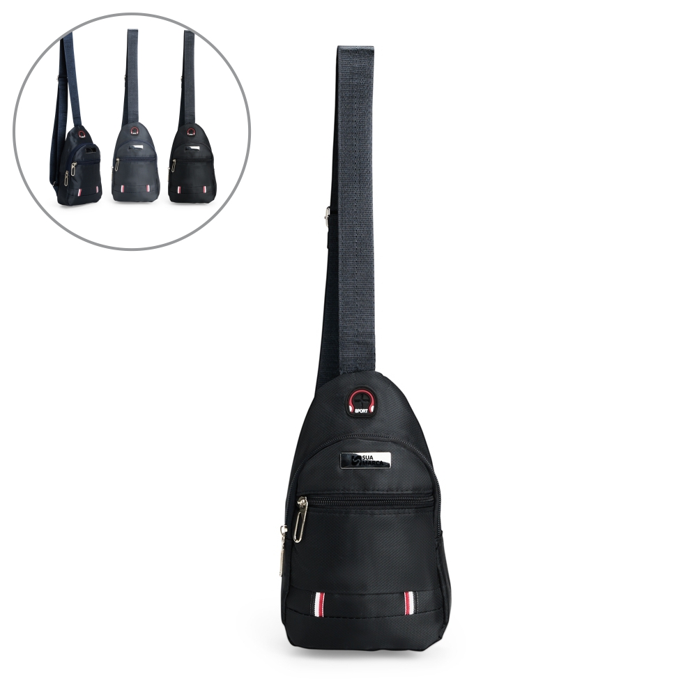 Mini bolsa confeccionada em tecido Oxford resistente à água e alça transversal ajustável em nylon. Possui dois compartimentos e um bolso interno, todos com fechamento em zíper, além de entrada para fones de ouvido e uma pequena placa metálica para personalização.