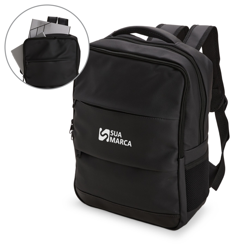 Conta ainda com três compartimentos frontais em tamanhos diferentes, além de dois bolsos em tecido respirável, o mesmo material de revestimento das alças para as costas e alça superior de mão.