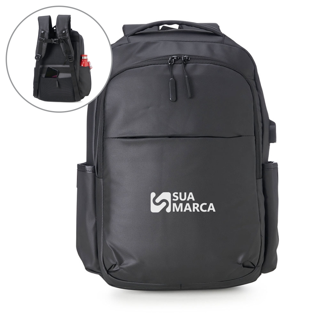 Mochila confeccionada em Couro Sintético com compartimento para notebook até 15,6 polegadas. Contém um compartimento grande com divisórias para documentos, eletrônicos, Notebook até 15,6 polegadas e tablet. Dois compartimentos frontais, sendo um com divisórias para documentos, eletrônicos e caneta. Um bolso traseiro oculto. Tecido Impermeável. Dois bolsos laterais e adaptador USB externo com cabo acoplado, permitindo a conexão de um carregador portátil de dentro da mochila e transferência da carga para o lado externo, ocultando o carregador e viabilizando a utilização do celular durante o processo. Contém zíperes com pegadores plásticos, alça de mão em nylon, alças para as costas ajustáveis com revestimento espumado antitranspirante.