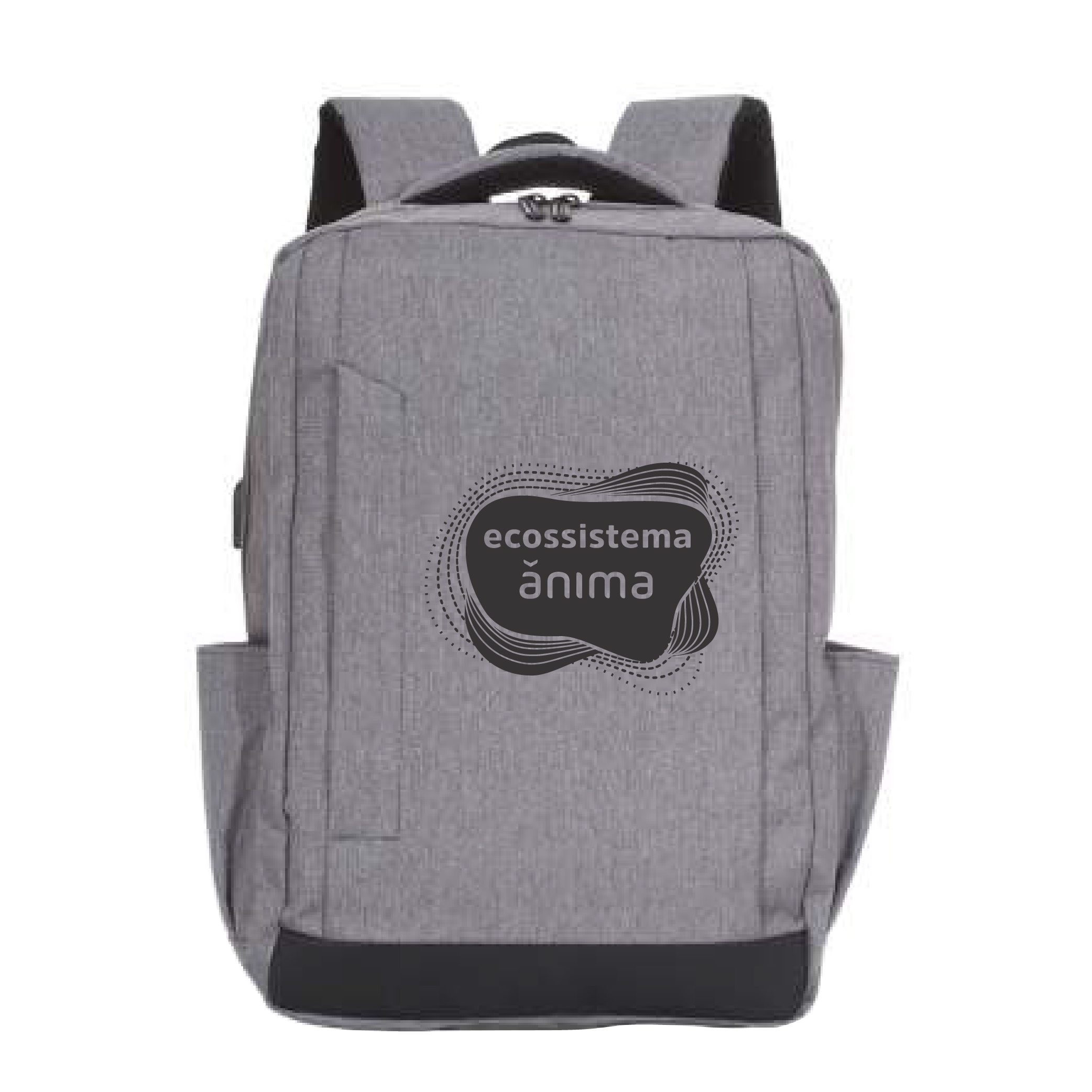 Mochila de nylon com compartimento principal com bolso para notebook 15.6 polegadas, possui divisórias para documentos e caneta, compartimento frontal com abertura vertical, bolsos laterais com revestimento interno emborrachado e dispositivo com entrada USB na parte externa, seu cabo USB acoplado internamente permite a conexão de um carregador portátil na área interna e a conexão de um eletrônico na área externa, viabilizando a carga e utilização do eletrônico enquanto caminha. Contém zíperes preto, faixa emborracha na área inferior frontal, alça horizontal para encaixe em malas de viagem, alças para costas ajustáveis com revestimento anti-transpirante e duas alças de mãos em nylon, sendo uma delas com revestimento interno.