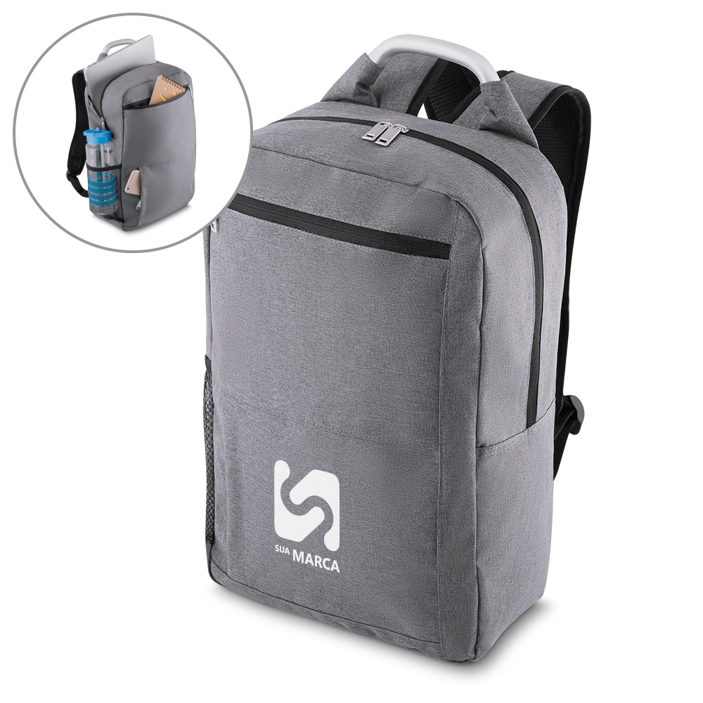 Descrição: Mochila porta notebook confeccionada em nylon, possui bolso frontal, bolsos laterais em malha, bolso superior com porta notebook na parte interna. Alça de mão em aço, alças ajustáveis para as costas com revestimento de espuma para maior conforto.