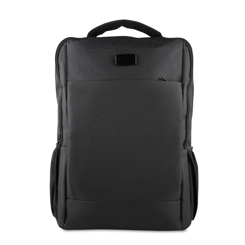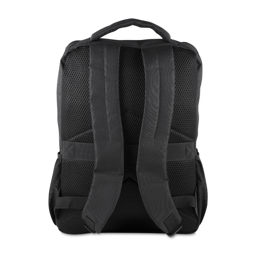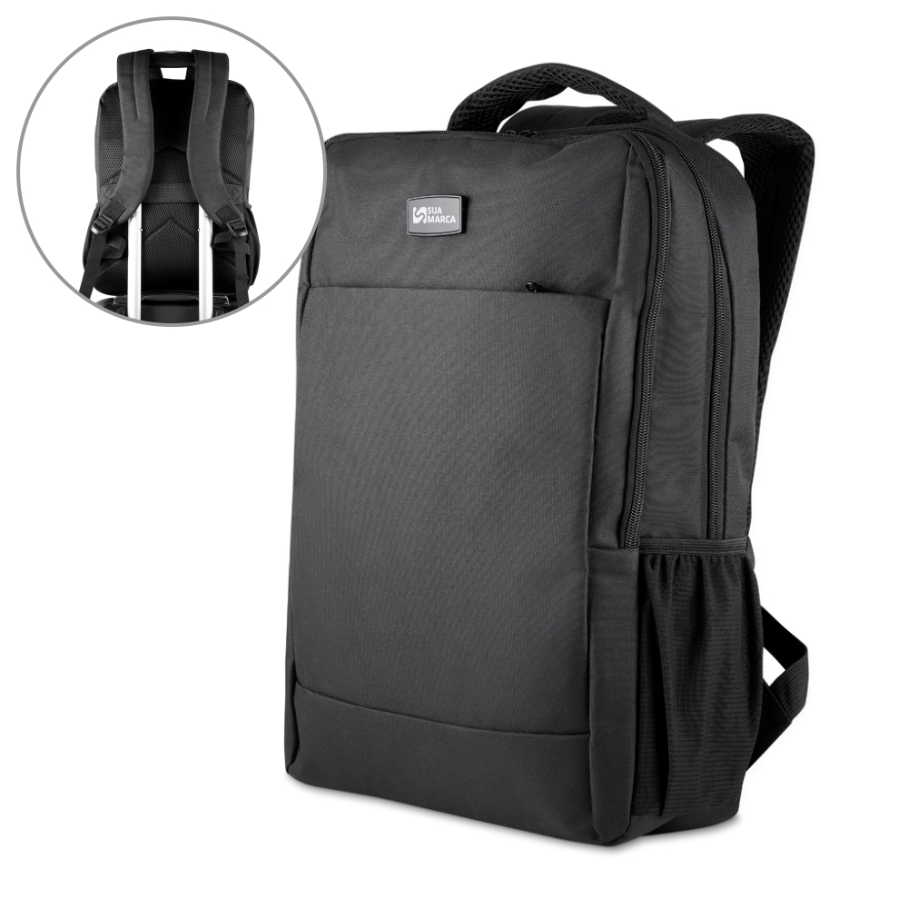 Mochila em poliéster 600D com interior em poliéster 210D e capacidade de 13L. Possui plaquinha metálica imantada (2,2x4,1 AxL) na parte frontal da mochila, bolso frontal com zíper, dois bolsos laterais, engate para mala de viagem e dois compartimentos com divisórias, incluindo espaço para notebook de até 15,6”.