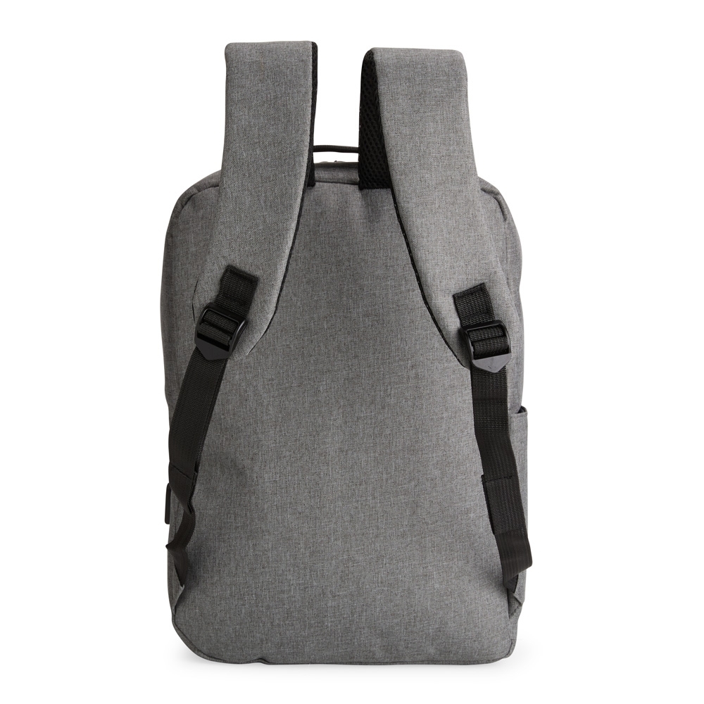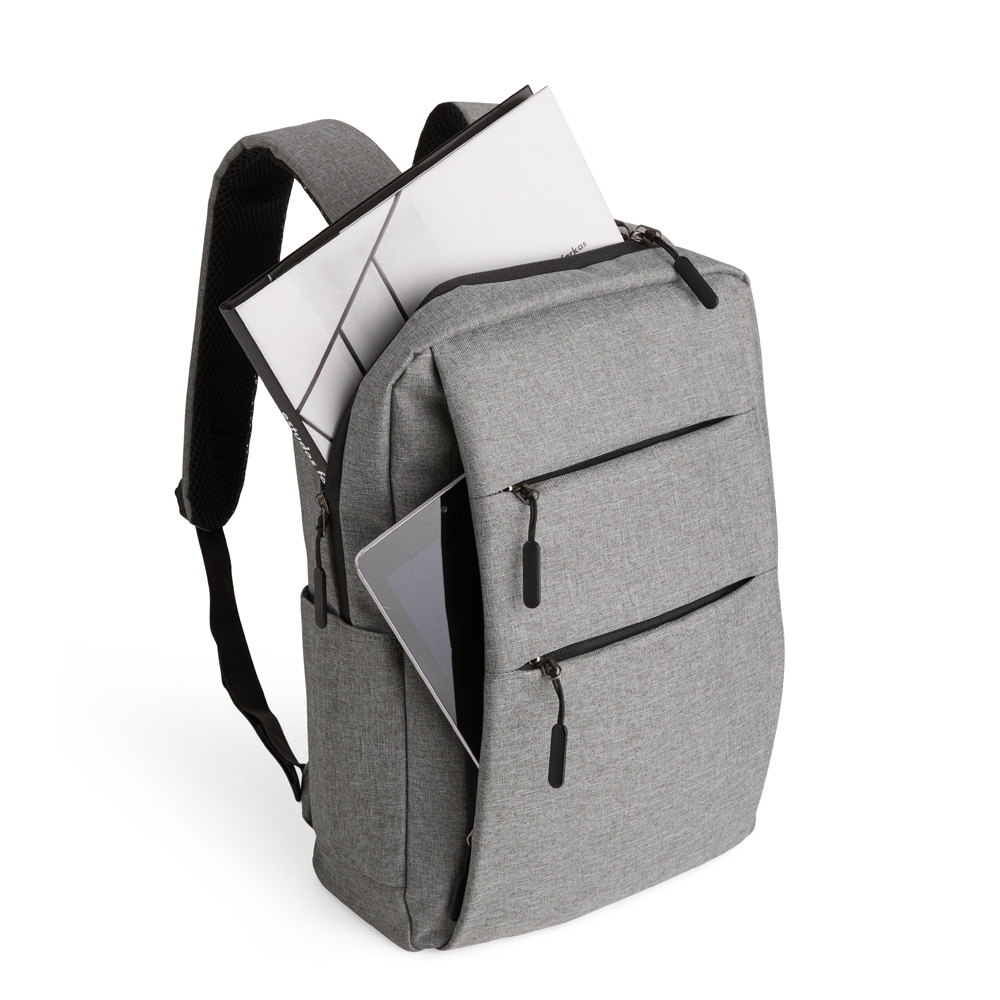 Possui três compartimentos externos, um deles com abertura lateral. Dispõe também de bolso lateral, porta USB, alça de mão em poliéster 210D e alças para as costas em tecido respirável.