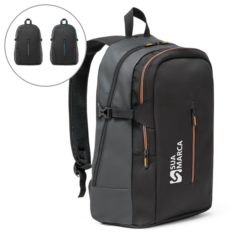 O compartimento posterior é forrado e tem divisória almofadada para notebook até 15,6" e bolso em tela, com zipper. O compartimento médio também é forrado e contém divesos bolsos interiores. A parte posterior e alças são almofadadas. 330 x 450 x 160 mm.