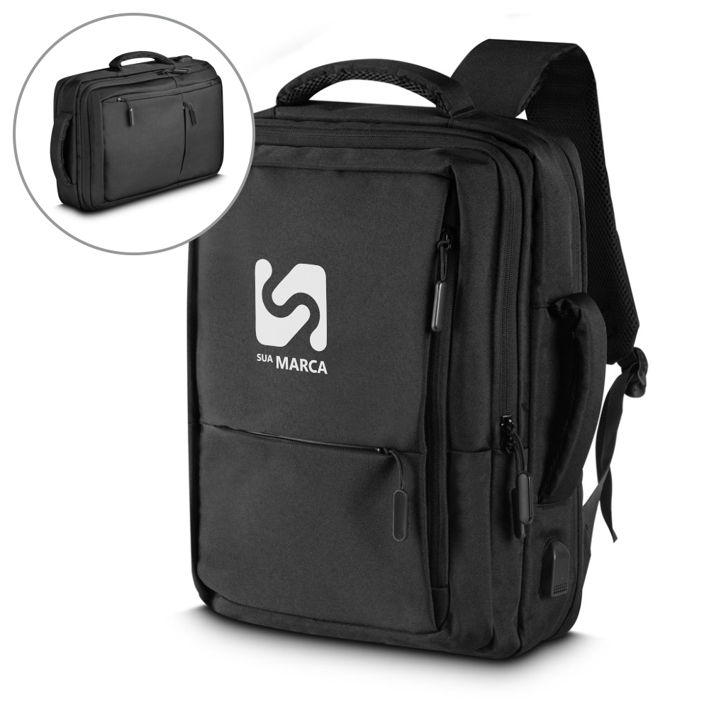 Mochila produzida em tecido de poliéster, alça de ombro e mão acolchoada, 2 bolsos frontais e divisórias internas, aceita notebooks de até 15,6", porta USB na lateral da mochila, possui engate para mala de viagem.
