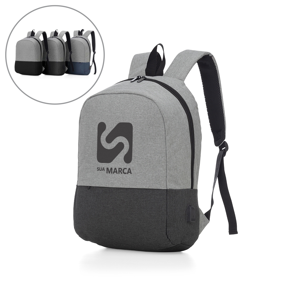 Descrição: Mochila confeccionada em Poliéster com capacidade para 22 litros. Contém bolso frontal com zíper, alça de mão em nylon, Porta USB lateral, e alças para as costas ajustáveis com revestimento antitranspirante. Possui bolso interno para notebook até 17 polegadas.