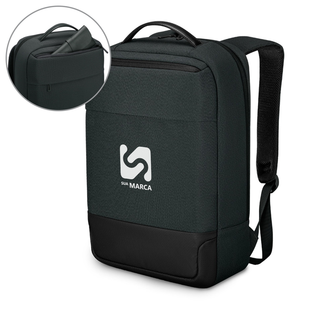 Mochila premium, produzida com poliéster acolchoado e interior em 210D, alças de ombro acolchoadas, interior com divisórias com zíper para acomodar pequenos objetos, bolso frontal com zíper e na parte das costas uma divisória atrás, com engate para mala de viagem, aceita notebook de até 15,6”. Mochila resistente a água.