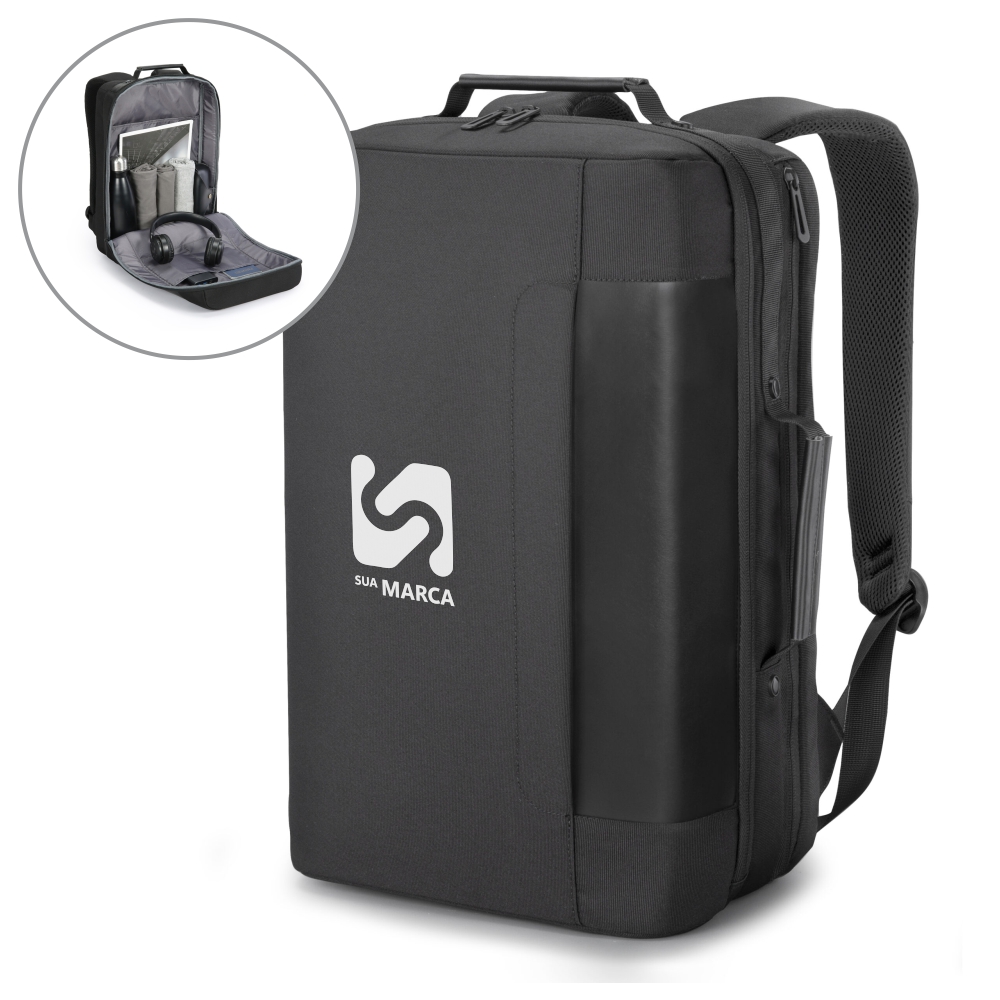 Mochila premium, produzida com poliéster acolchoado, alças de ombro acolchoadas, interior com divisórias, bolso frontal com zíper e na parte das costas uma divisória atrás do engate para mala de viagem, aceita notebook de até 15,6”.
