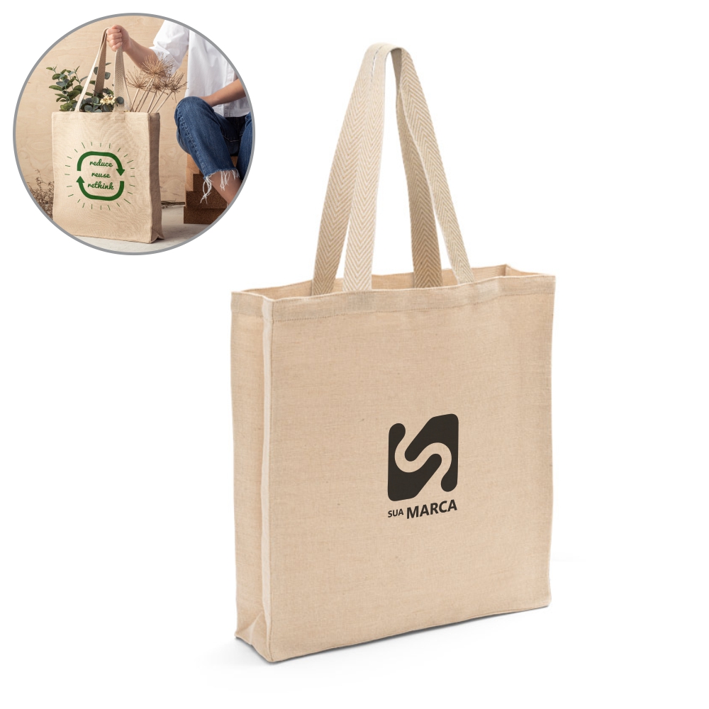 Sacola em juco (275 g/m²) com bolso interior 100% algodão (120 g/m²) com fecho e alças de 60 cm. Pegas em webbing de algodão bicolor. 370 x 410 x 90 mm.