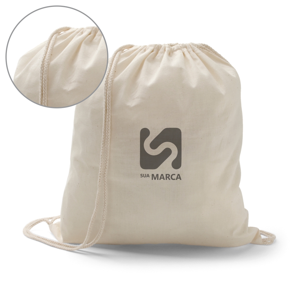 Sacola tipo mochila. 100% algodão. 370 x 410 mm.