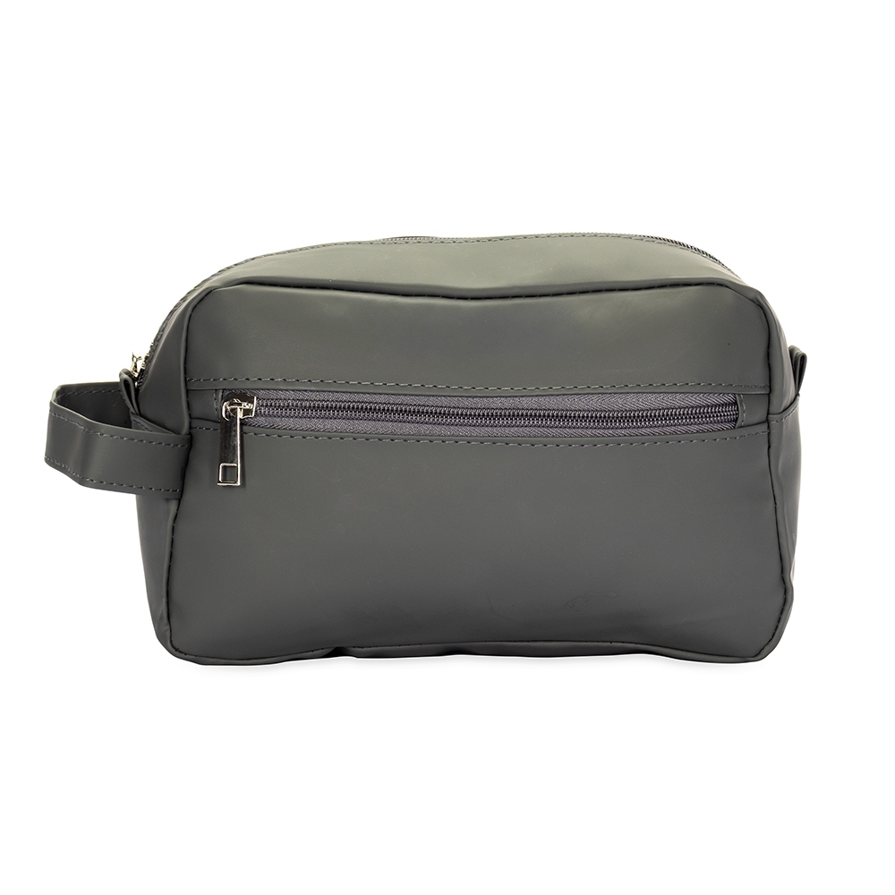 Nécessaire confeccionado em couro sintético impermeável. Possui compartimento principal com fechamento em zíper, além de um bolso frontal externo, alça de mão e duas alças menores para fixação de chaveiro ou gancho.