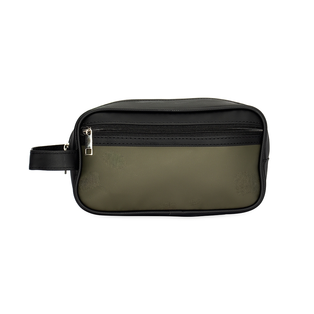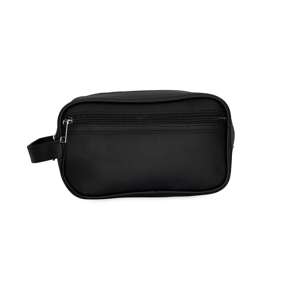 Nécessaire em couro sintético impermeável com fechamento em zíper. Possui bolso frontal também com zíper e alça lateral de mão.