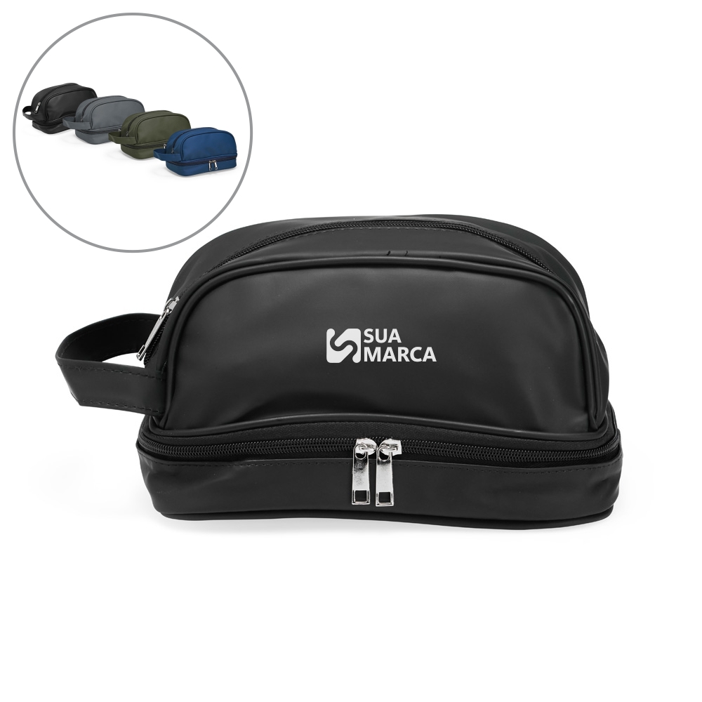 Nécessaire confeccionada em couro sintético impermeável. Possui alça lateral de mão e dois compartimentos: o principal, na parte superior, e outro na parte inferior, ambos com fechamento em zíper.