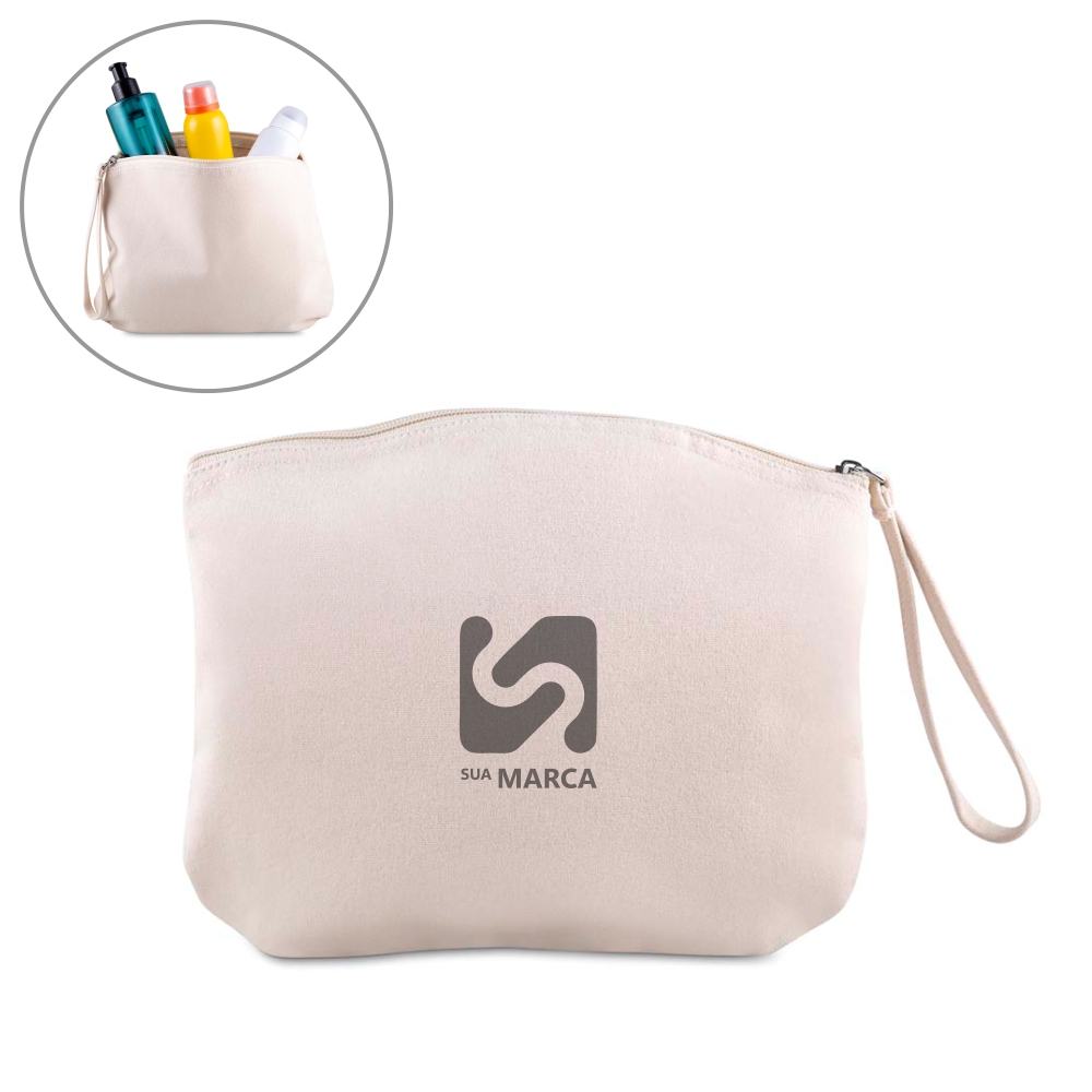 Necessaire confeccionada em algodão reciclado de 340 g/m², conta com alça de mão em algodão que facilita o transporte, sendo prática e resistente para organização de objetos pessoais.