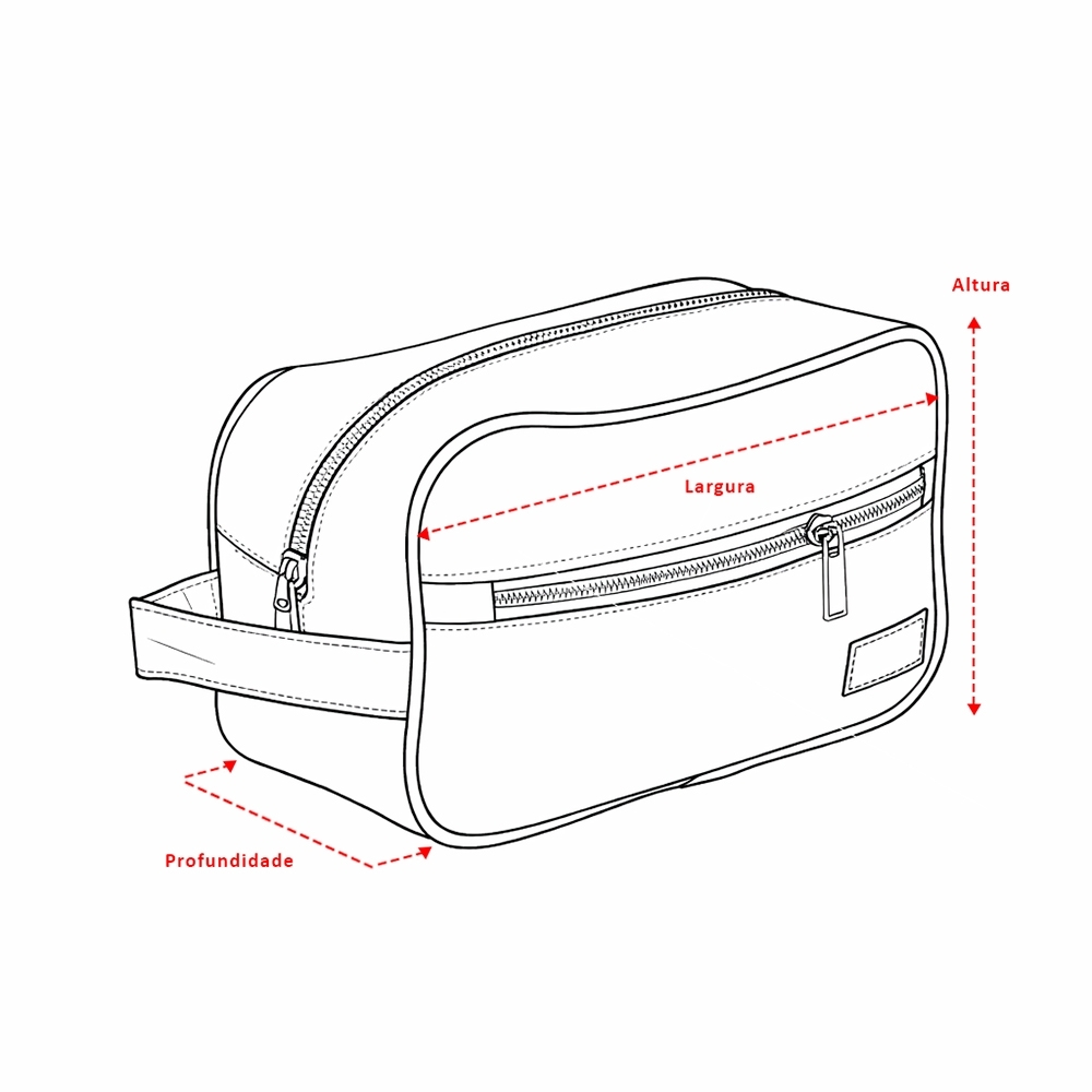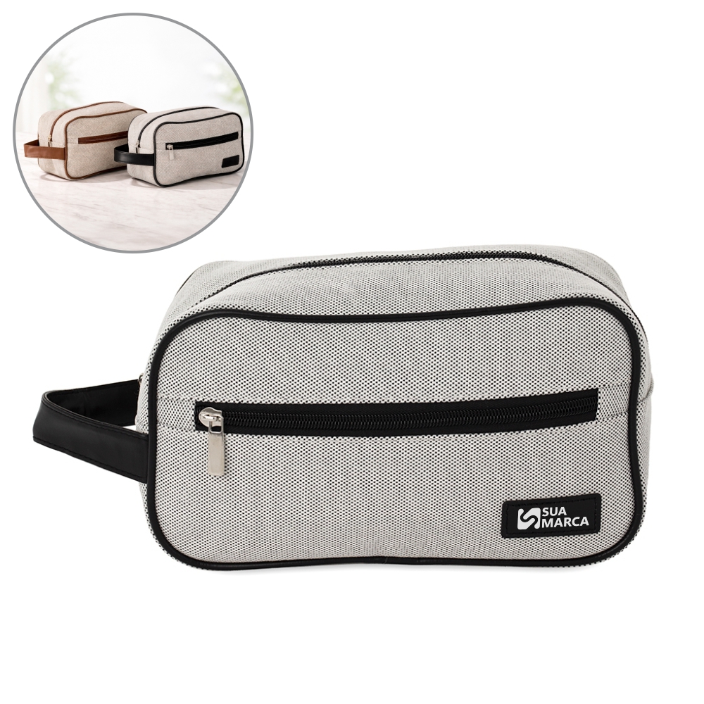 Nécessaire confeccionada em lona e fechamento em zíper. Possui bolso frontal e compartimento principal com três bolsos internos, além de alça lateral e plaquinha costurada em couro sintético.