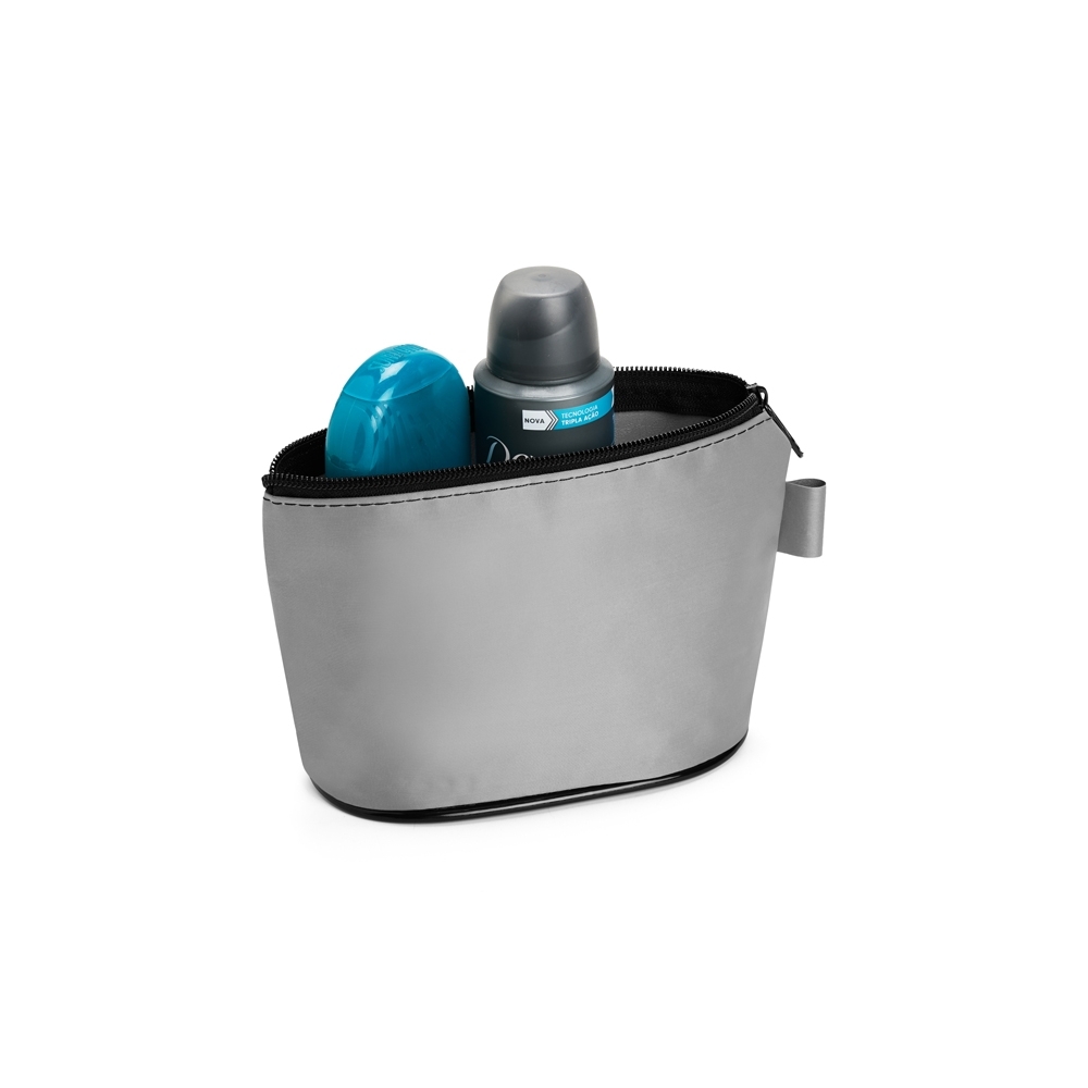 Descrição: Nécessaire confeccionado em nylon impermeável, fechamento em zíper e alça pequena para acesso de chaveiro ou gancho.